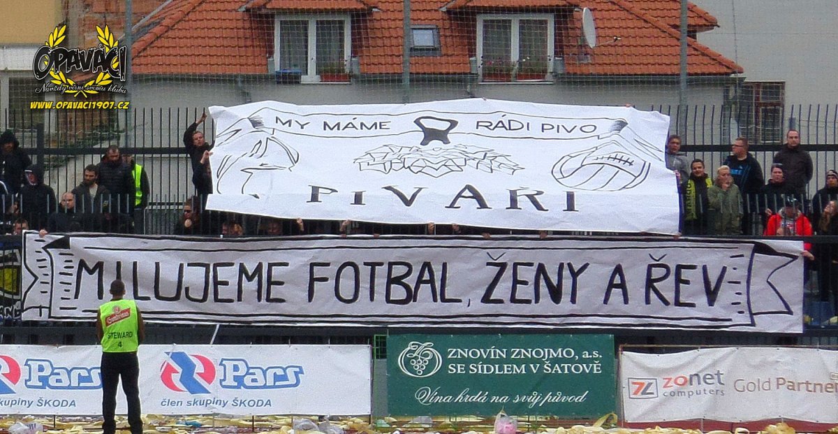Poslední víkend jsem sehráli zápas na půdě Znojma. Velká část fanoušků se na jih Moravy vydala už o den dříve a využila tak pohostinnosti v místních sklípcích. Je pravda, že na některá místa ve Znojmě nikdy nezapomeneme, protože jsem kolem nich během našeho bloudění projeli několikrát. Ale nakonec vše dobře dopadlo. Po degustaci místního vína vyrážíme v nočních hodinách na tamní diskotéku, kde se k našemu překvapení setkáváme s druhou velmi početnou skupinou opavských příznivců. Když si odmyslíme odlišné prostředí, tak se zde cítím opravdu jako doma v Opavě. Někteří z nás paří až do ranních hodin. To se projevilo především na odpoledním fotbale, který začínal už ve 14:00. Při pohledu na osazenstvo v sektoru je hned na první pohled vidět, že jsem zakalili opravdu kvalitně. To se odráží také na našem supportu, který je opravdu hodně žalostný, ale s tím se dalo počítat. V druhém poločase se část fanoušků baví zaměstnáváním jednoho z pořadatelů, když na něj neustále hází konfety a nastříhané papírky, které byly původně připraveny na argentýnu. Tento pořadatel to psychicky nezvládá a nakonec dojde i k jeho vystřídání. Kvůli konfetám je dokonce na chvíli přerušeno utkání. Vrcholem naší návštěvy znojemského stadionu je vytažení chorea, které je parodií na televizní seriál Vinaři a jeho úvodní znělku. Na plachtě je nápis „Pivaři“ společně s nápisem „My máme rádi pivo“ doplněno siluetou dívky, retro balonu, chmelu a otvíráku na pivo. Na plotě pak visí nápis „Milujeme fotbal, ženy a řev“. Během druhého poločasu jsou ještě odpáleny asi 3 zatoulané stroboskopy, za což je vyveden jeden fanoušek a předán policii. Podaří se mu ale utéct a po zápase je vyzvednut. Z Opavy do Znojma přicestovalo 86 fanoušků, což je náš nový rekord v této destinaci. Zápas končí remízou 1:1. Ikdyž jsme mohli vyhrát, tak s bodem jsme spokojeni, loučíme se s hráči a odcházíme ze stadionu.