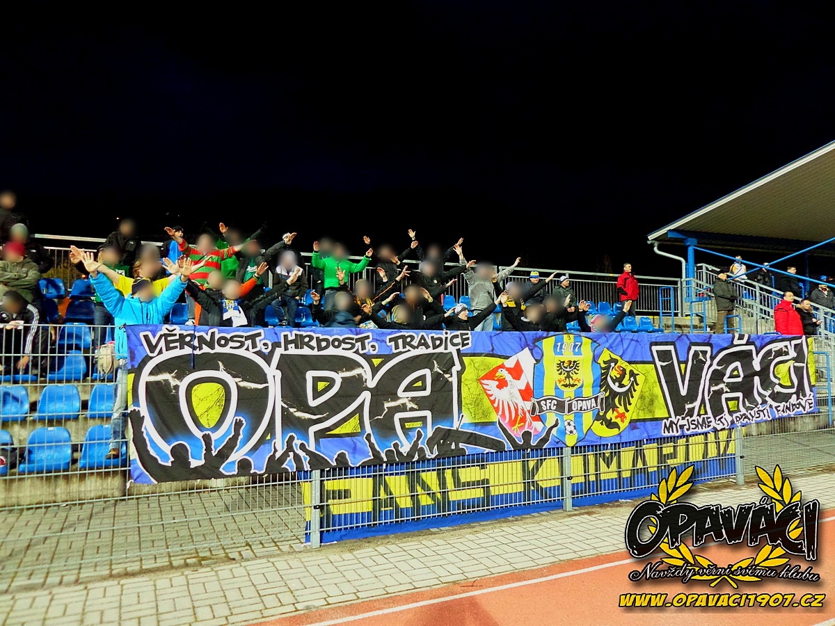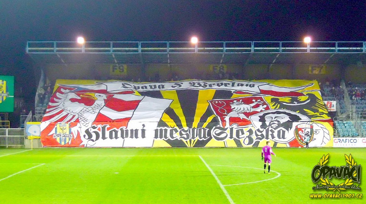 Po zlepšeném výkonu a výhře nad Kolínem byli všichni opavští fanoušcích v očekávání, jak se tento úspěch promítne do duelu proti momentálně vedoucímu týmu 2. Ligy. Hodinu před zápasem se scházíme a domlouváme se na detailech chystané prezentace a rozmísťujeme na tribuně žluté a modré pásy. Před začátkem utkání se však zdálo, že na chystanou choreografii nedojde vzhledem k nízkému počtu fanoušků v kotli. Nakonec přicházejí opozdilci a náš sektor se relativně slušně zaplňuje. První poločas, co se fandění týče, nebyl nikterak oslnivý. Ve druhém poločase se support zvedl, přesto mohl být lepší. V 60. minutě na plotě roztahujeme nápis „Náš svět nezničíte!“ , který je doplněný o piktogramy. Po nápise přicházejí na řadu připravené pásy. Bohužel jejich roztažení se nepovedlo podle našich představ, 2 pásy zůstali dokonce netknutě ležet. Stejně tak následně odpálení pyrotechniky nebylo podle domluveného scénáře. Ale tento problém nás provází už další dobu a nevím, jestli se ho někdy zbavíme. Ale výsledný efekt není nakonec zas tak špatný, nicméně mohl být rozhodně lepší. Především mohlo být více pyra. Bylo odpáleno celkem 50 ohňů, 30 bílých stroboskopů, 20 červených stroboskopů, a nějaké modré a žluté dýmovnice. na posledních zhruba 20 minut zápasu vytahujeme ještě vlajky na tyčích, které vlají až do závěrečného hvizdu. Jakmile rozhodčí odpískal konec zápasu, odpalujeme ještě dalších 20 ohňů nad nápisem na plotě. I přes fakt, že po většinu utkání jsme byli lepším týmem a připravili jsem si i nějakou tu šanci na vstřelení branky prohráváme 1:0. Impotence našich hráčů ve střílení branek je opravdu zarážející, zvlášť při faktu, co všechno jsme schopni zahodit. V dalším kole nás čeká atraktivní výjezd do Karviné. Letos jsme překonali náš početný rekord ve Frýdku-Místku, Třinci i Žižkově. Pojeďme ve velkém počtu i nyní do Karviné a překonat další výjezdový rekord!!!! Věříme, že v utkání s Karvinou hráči na střeleckou mizérii zapomenou a my se budeme moct společně s nimi radovat ze zisku tří bodů! JEDEME VŠICHNI!!!!!