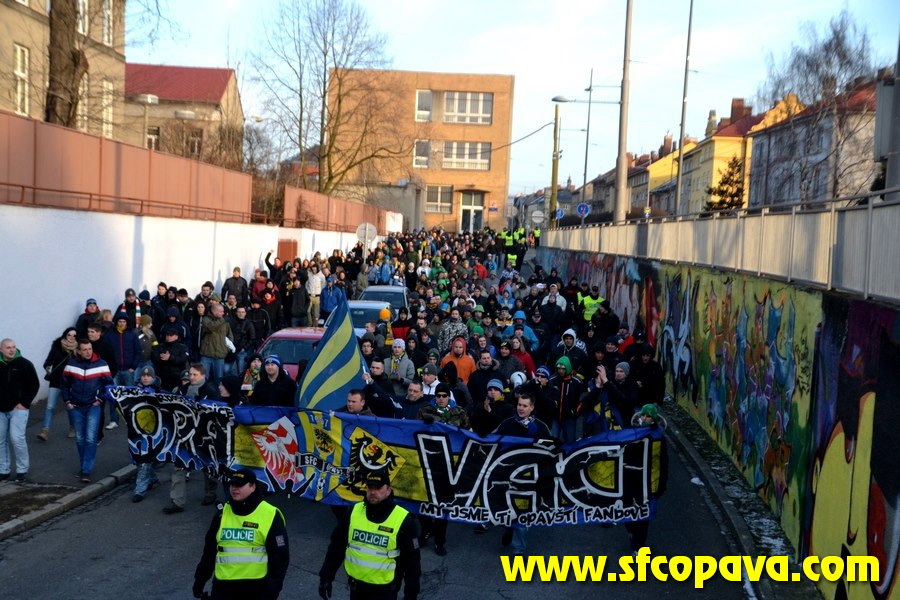 Naše sobotní představení se dá hodnotit jedině pozitivně. Vše vyšlo přesně podle našich představ. Ještě před samotným zápasem jsme se sešli na Horním náměstí, kde jsme zhruba něco po půl páté začali naplánovanou demonstraci proti současnému vedení fotbalového klubu. I když to ze začátku vůbec nevypadalo, nakonec se nás sešlo okolo 350 příznivců SFC. Po té co jeden ze zástupců fanoušků přednesl několik bodů našeho nespokojení s funkcionáři klubu jsme se vydali směr Městské sady. V proslovu jsme si také připomněli událost, která se stala v Polsku, při níž zahynuli 3 fanoušci Lechie Gdansk a uctili jejich památku minutou ticha. První část pochodu jsme šli z piety v tichosti. Když jsme dorazili zhruba na začátek Krnovské ulice, začali jsme se také projevovat svými hlasivkami. Několikrát zazněl pokřik „Matýsek a Kutty ven“, ale také jsme skandovali hesla na podporu Opavy. První lajna průvodu nesla vlajku Opaváci a občas se objevily i nějaké bengály. Pochod byl ukončen pod sekretariátem, kde jsme naposled mohutně skandovali proti vedení klubu. Po té se všichni fanoušci přesunuli na stadion, kde začalo naše představení číslo dvě.