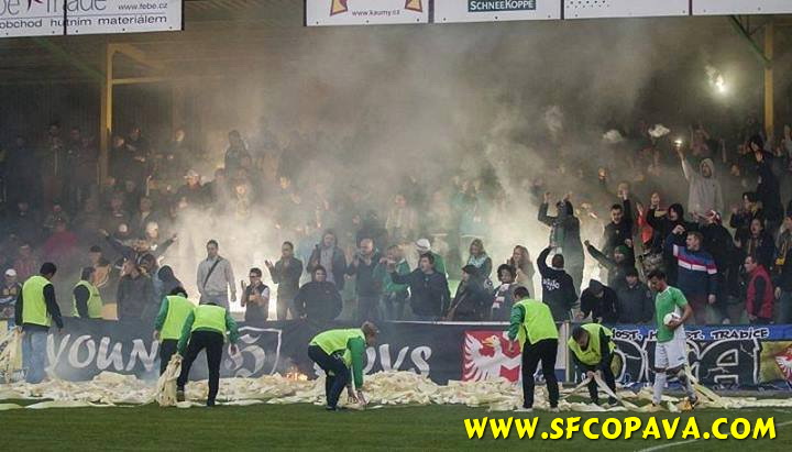 V Hlučíně je vždy problém s vyvěšením vlajek. Ne jinak tomu bylo i letos. Vlajky jsme pověsili na plot, který byl bohužel nízký a tak se stalo, že vlajka Young Boys a vlajka Opaváci leželi z části na zemi. Další vlajky co zde vyseli byly Fans Suché Lazce a Fans Štěpánkovice. Více vlajek by ani nebylo kam pověsit. Náš sektor byl docela široký, což nám možná trošku uškodilo. I když se hlavní skupinka fanoušků snažila stát po celý zápas u sebe, tak někteří se lehce oddalovali a vznikala mezi námi hluchá místa. Naše povzbuzování odpovídalo zhruba našemu počtu. I díky zastřešené tribuně jsem našim hráčům připravili téměř domácí prostředí. Fanoušci Hlučína se také snažili, ale na naší straně tribuny je nebylo skoro slyšet. V druhém poločase jsme si zpestřili fandění také konfetami a stroboskopy. Výsledný efekt nebyl špatný, ale mohl být ještě lepší. Popravdě nechápu, proč někteří fanoušci neodpálili všechny stroboskopy najednou. Po této pyrotechnické vložce z 60.minuty jsme mohli vidět občasně hořící stroboskopy téměř až do konce zápasu. Kdyby tito lidé dělila co měli, tak by to určitě vypadalo ještě lépe. Jedna z dalších věcí, co se pro mě stala nepochopitelnou je vhození stroboskopu směrem k ke slavícím hráčům SFC po vstřeleném gólu. Několik stroboskopů skončilo i na hřišti. Vzhledem k tomu, že zde leželo docela velké množství konfet měli místní pořadatelé chvílemi plné ruce práce, aby hořící papíry uhasili. Co se týče našeho fanouškovského repertoáru, využili jsem našeho solidního počtu a rozdělili si sektor na dvě části a začali se navzájem přeřvávat a navzájem si odpovídat. Fanoušci Opavy se prostě opět bavili. Co se mi ale nelíbilo byla opět reakce velkého množství fanoušků SFC, kteří po vyrovnávací brance domácích jako by byli opařeni najednou přestali skoro fandit. Tato reakce mě opravdu vytočila. Chápu, že lidé mohli být rozladěni z té srovnávací branky, která padla asi 5 minut před koncem zápasu, ale SFC nefandíme přece jenom když se vede, ale snad za každého výsledku. To by si fanoušci měli uvědomit.
