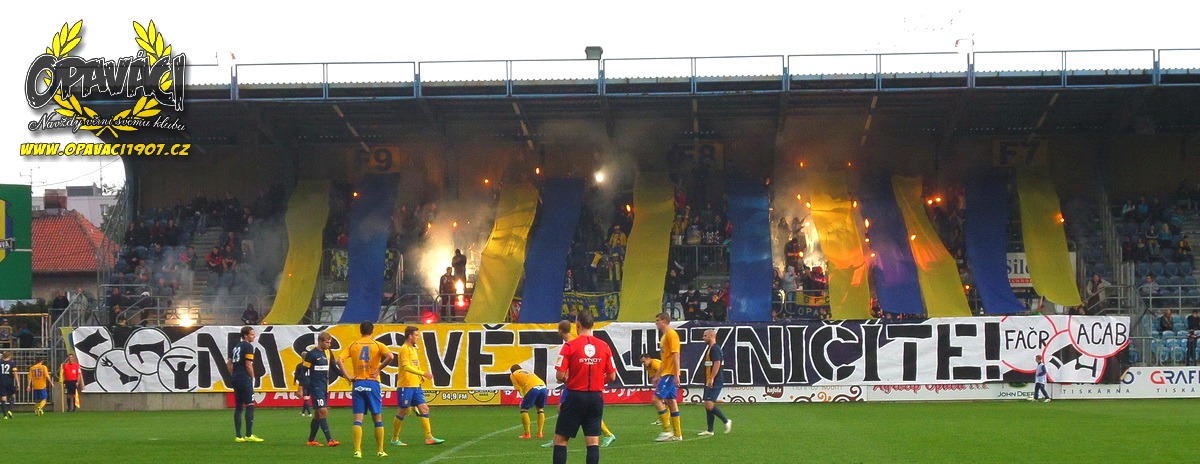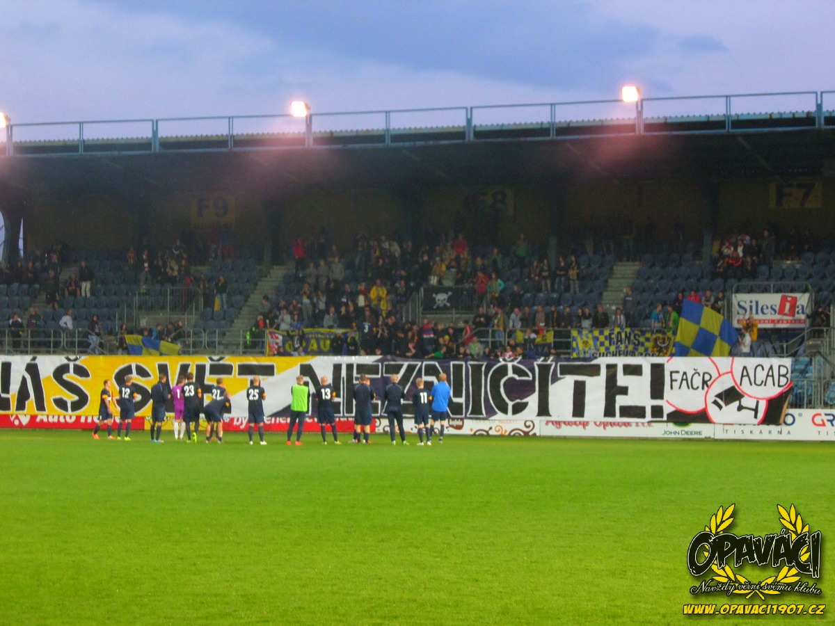 Po zlepšeném výkonu a výhře nad Kolínem byli všichni opavští fanoušcích v očekávání, jak se tento úspěch promítne do duelu proti momentálně vedoucímu týmu 2. Ligy. Hodinu před zápasem se scházíme a domlouváme se na detailech chystané prezentace a rozmísťujeme na tribuně žluté a modré pásy. Před začátkem utkání se však zdálo, že na chystanou choreografii nedojde vzhledem k nízkému počtu fanoušků v kotli. Nakonec přicházejí opozdilci a náš sektor se relativně slušně zaplňuje. První poločas, co se fandění týče, nebyl nikterak oslnivý. Ve druhém poločase se support zvedl, přesto mohl být lepší. V 60. minutě na plotě roztahujeme nápis „Náš svět nezničíte!“ , který je doplněný o piktogramy. Po nápise přicházejí na řadu připravené pásy. Bohužel jejich roztažení se nepovedlo podle našich představ, 2 pásy zůstali dokonce netknutě ležet. Stejně tak následně odpálení pyrotechniky nebylo podle domluveného scénáře. Ale tento problém nás provází už další dobu a nevím, jestli se ho někdy zbavíme. Ale výsledný efekt není nakonec zas tak špatný, nicméně mohl být rozhodně lepší. Především mohlo být více pyra. Bylo odpáleno celkem 50 ohňů, 30 bílých stroboskopů, 20 červených stroboskopů, a nějaké modré a žluté dýmovnice. na posledních zhruba 20 minut zápasu vytahujeme ještě vlajky na tyčích, které vlají až do závěrečného hvizdu. Jakmile rozhodčí odpískal konec zápasu, odpalujeme ještě dalších 20 ohňů nad nápisem na plotě. I přes fakt, že po většinu utkání jsme byli lepším týmem a připravili jsem si i nějakou tu šanci na vstřelení branky prohráváme 1:0. Impotence našich hráčů ve střílení branek je opravdu zarážející, zvlášť při faktu, co všechno jsme schopni zahodit. V dalším kole nás čeká atraktivní výjezd do Karviné. Letos jsme překonali náš početný rekord ve Frýdku-Místku, Třinci i Žižkově. Pojeďme ve velkém počtu i nyní do Karviné a překonat další výjezdový rekord!!!! Věříme, že v utkání s Karvinou hráči na střeleckou mizérii zapomenou a my se budeme moct společně s nimi radovat ze zisku tří bodů! JEDEME VŠICHNI!!!!!